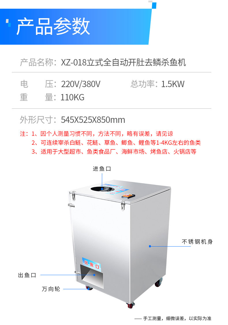 名稱(chēng)開(kāi)肚殺魚(yú)去鱗機(jī) 電源220/380V 功率1.5kw 產(chǎn)量 尺寸545×525×850mm 重量110kg 規(guī)格 其他