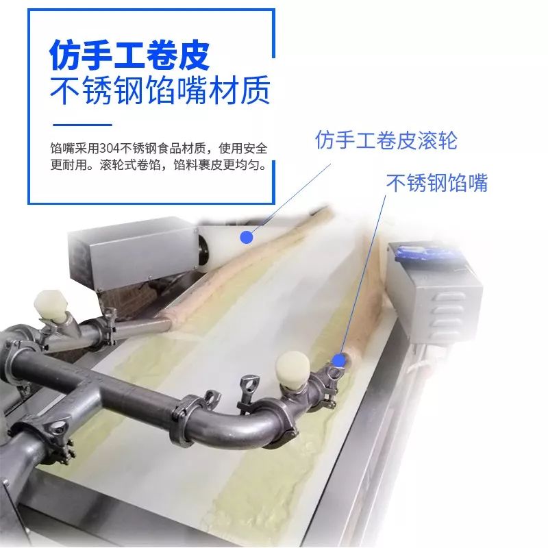 / 腐皮卷機(jī)是一款完全取代手工包各種腐皮類的機(jī)器,完全解決傳統(tǒng)手工包個(gè)種肉卷、卷章、魚卷、蝦卷、福建五香卷、潮汕肉條、腐皮蝦卷、墨魚卷、芋泥卷、地瓜卷等各種卷類食品。做出的各種卷類食品造型好看、長(zhǎng)短均勻,葉片泵的供料機(jī)不破壞物料原有形狀,獨(dú)有的圓形收口切斷設(shè)計(jì)使其接近手工制作。全自動(dòng)包漿、卷?xiàng)l、切斷成型,大大的提升了生產(chǎn)效率,滿足了批量化生產(chǎn)的速度要求。/